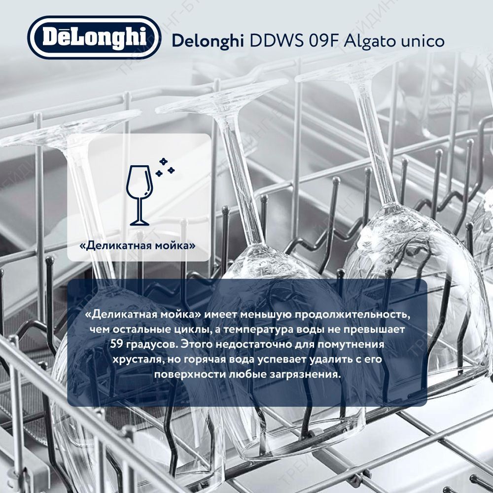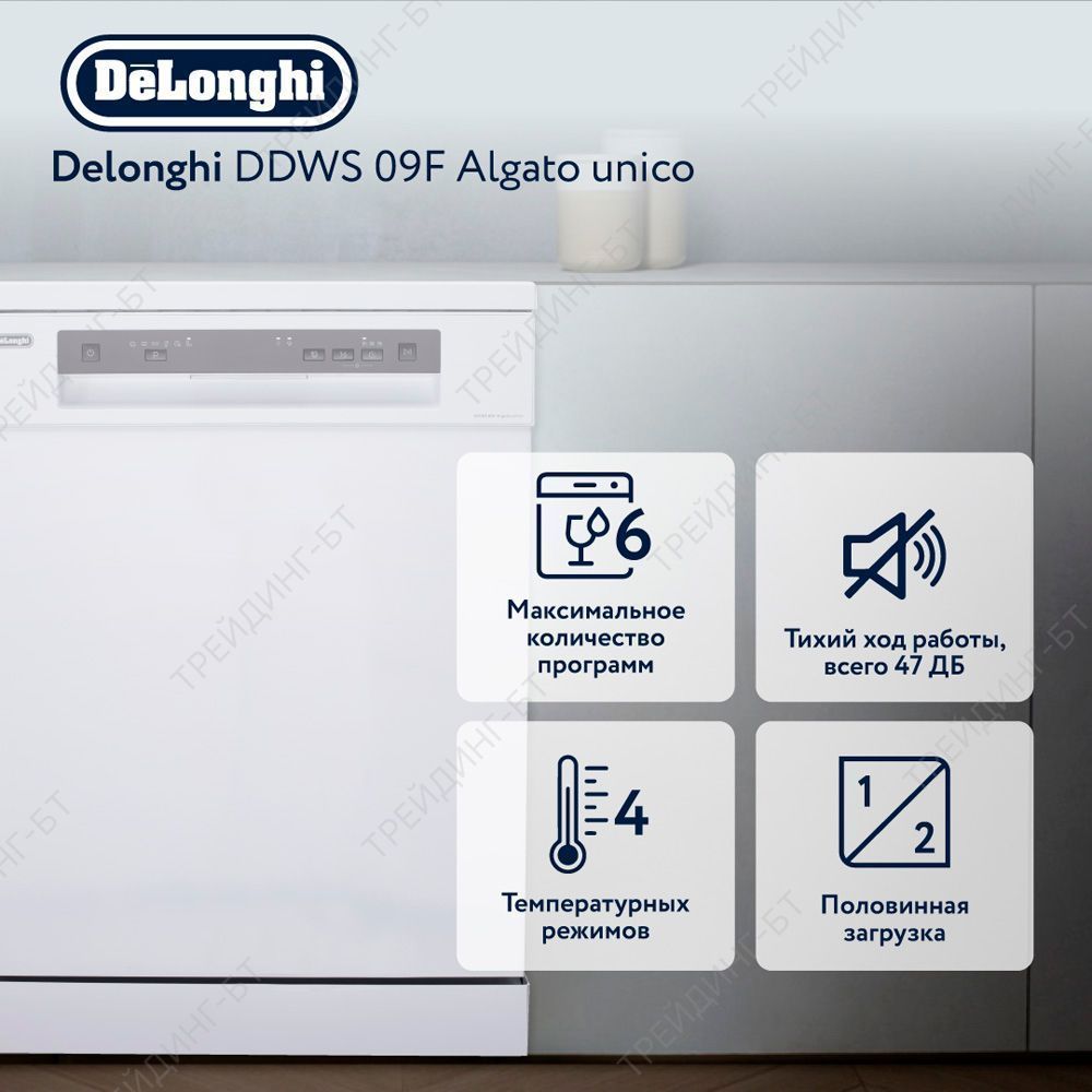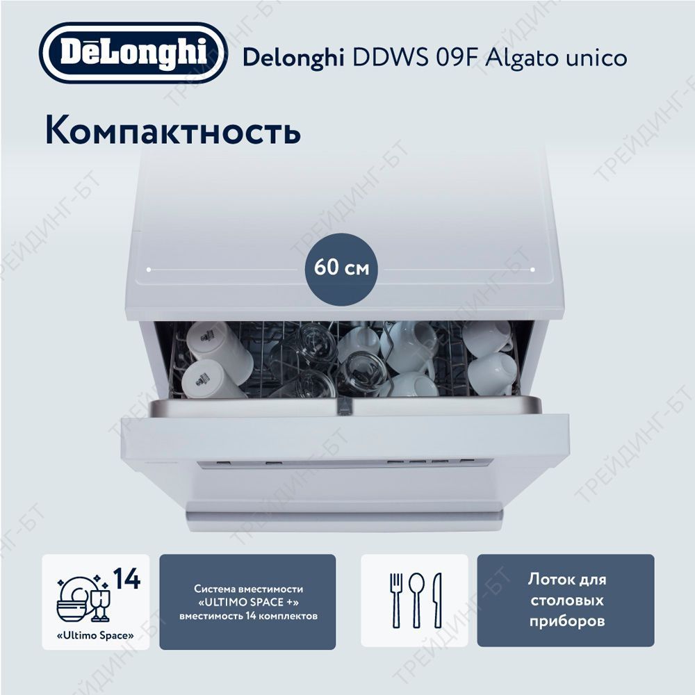 Посудомоечная машина DeLonghi DDWS 09F Algato unico относится к полноразмерным и отдельностоящим — ширина 60 см. Максимальная вместимость составляет 14 комплектов. Устройство собрано в Италии. Секрет качественной мойки не только марка моющего средства или материал корзины, но и правильная раскладка посуды в корзине. Тогда будет происходить правильное распределение потоков воды и расход моющего средства, также это влияет на продолжительность цикла. Регулируемая корзина по высоте. Для столовых приборов предназначен отдельный лоток, имеющий мелкоячеистые стенки — даже маленькая вилка или десертный нож не упадут внутрь камеры. Характерные особенности модели: возможность запуска с половинной загрузкой; работа на таблетках «3 в 1»; внутренняя подсветка. Еще одно достоинство модели — инновационные функции и опции, среди них для повседневной эксплуатации пригодятся: