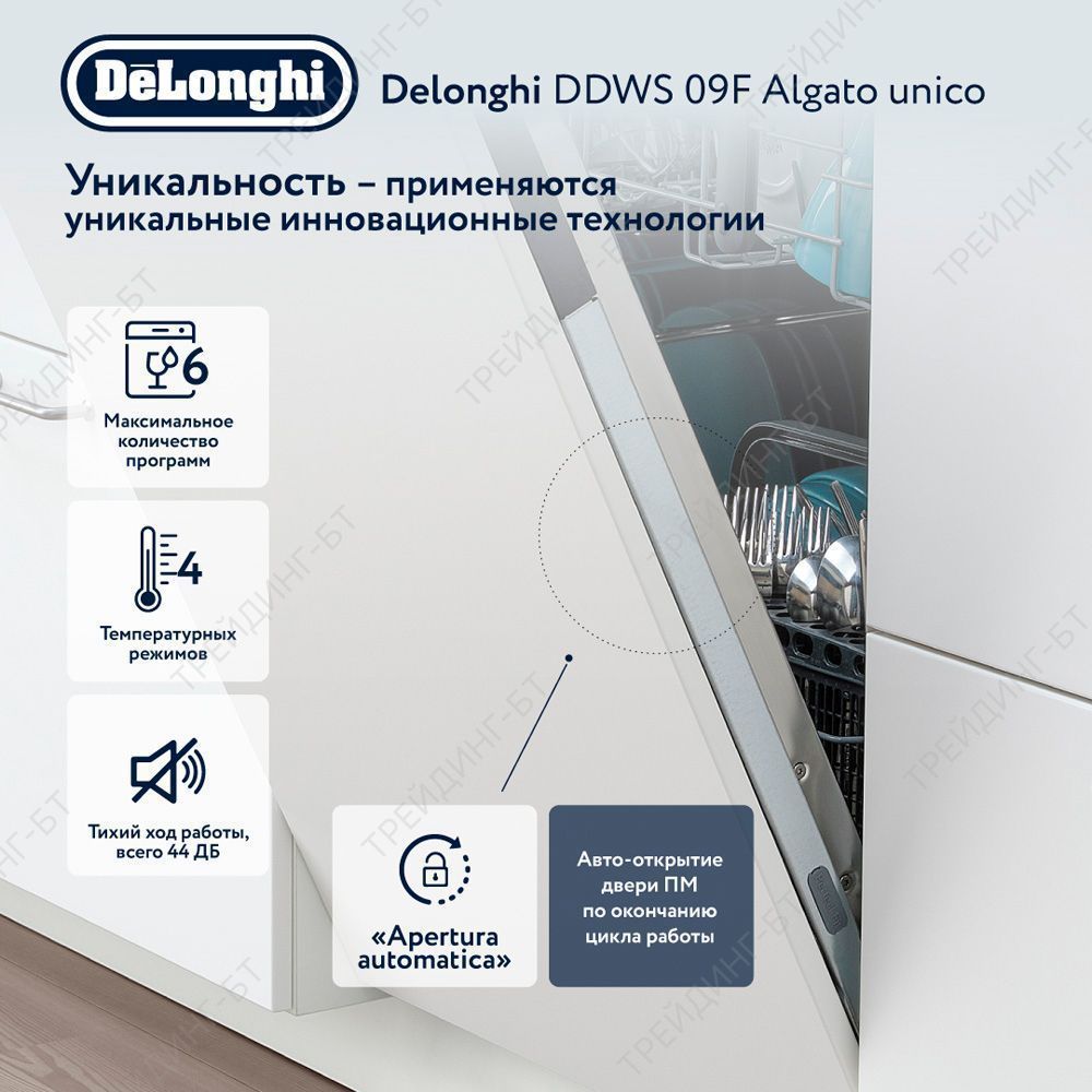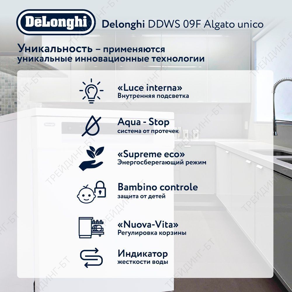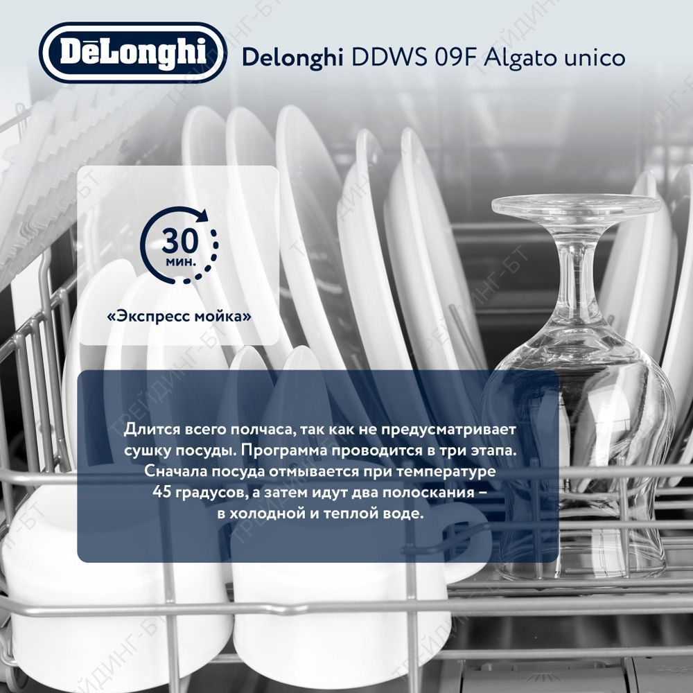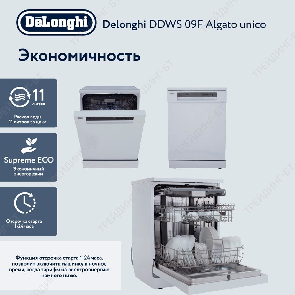 Посудомоечная машина DeLonghi DDWS 09F Algato unico относится к полноразмерным и отдельностоящим — ширина 60 см. Максимальная вместимость составляет 14 комплектов. Устройство собрано в Италии. Секрет качественной мойки не только марка моющего средства или материал корзины, но и правильная раскладка посуды в корзине. Тогда будет происходить правильное распределение потоков воды и расход моющего средства, также это влияет на продолжительность цикла. Регулируемая корзина по высоте. Для столовых приборов предназначен отдельный лоток, имеющий мелкоячеистые стенки — даже маленькая вилка или десертный нож не упадут внутрь камеры. Характерные особенности модели: возможность запуска с половинной загрузкой; работа на таблетках «3 в 1»; внутренняя подсветка. Еще одно достоинство модели — инновационные функции и опции, среди них для повседневной эксплуатации пригодятся: